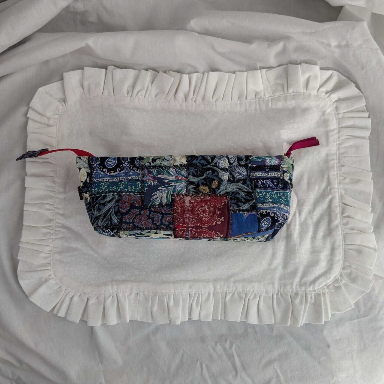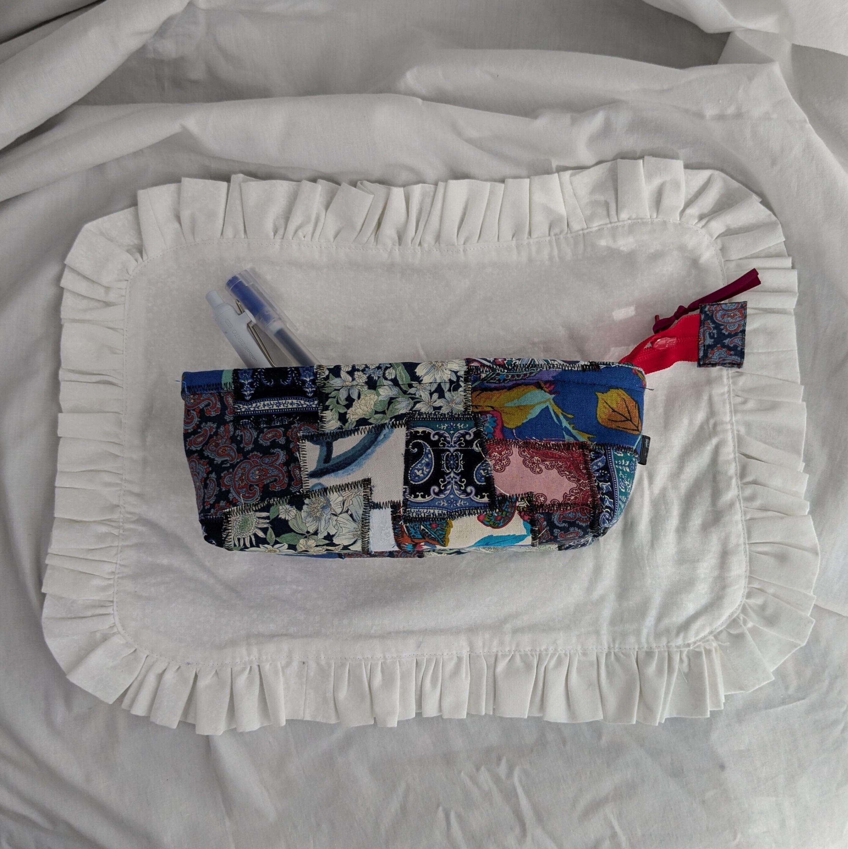 様々な柄の布を組み合わせて作った一点もののパッチワークのペンケースです。