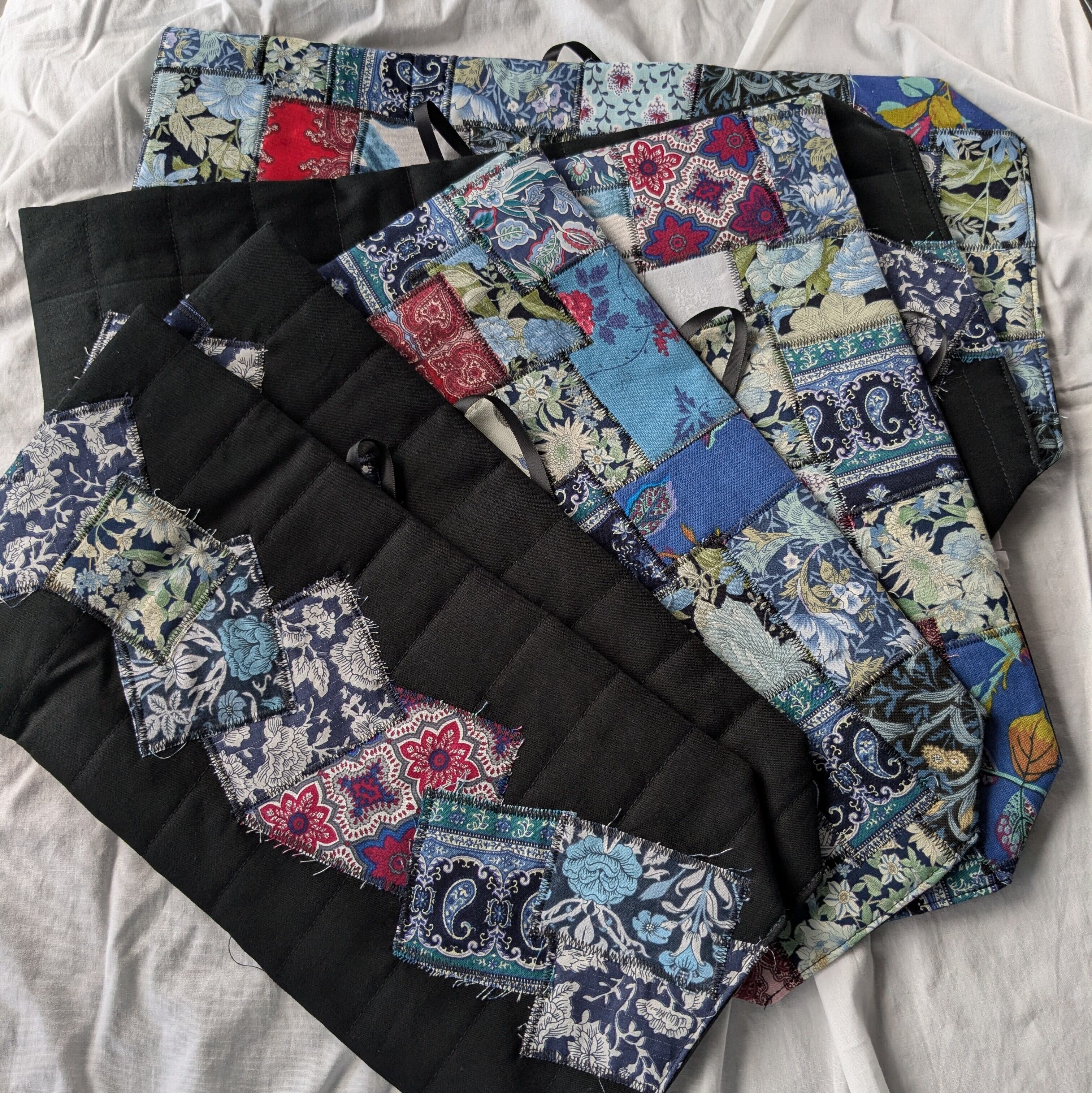 ジグザグミシンを使って端切れを並べてデザインした質感を楽しんでいただけるいただけると幸いです。ひとつひとつ手作りですので、同じデザインはありません。