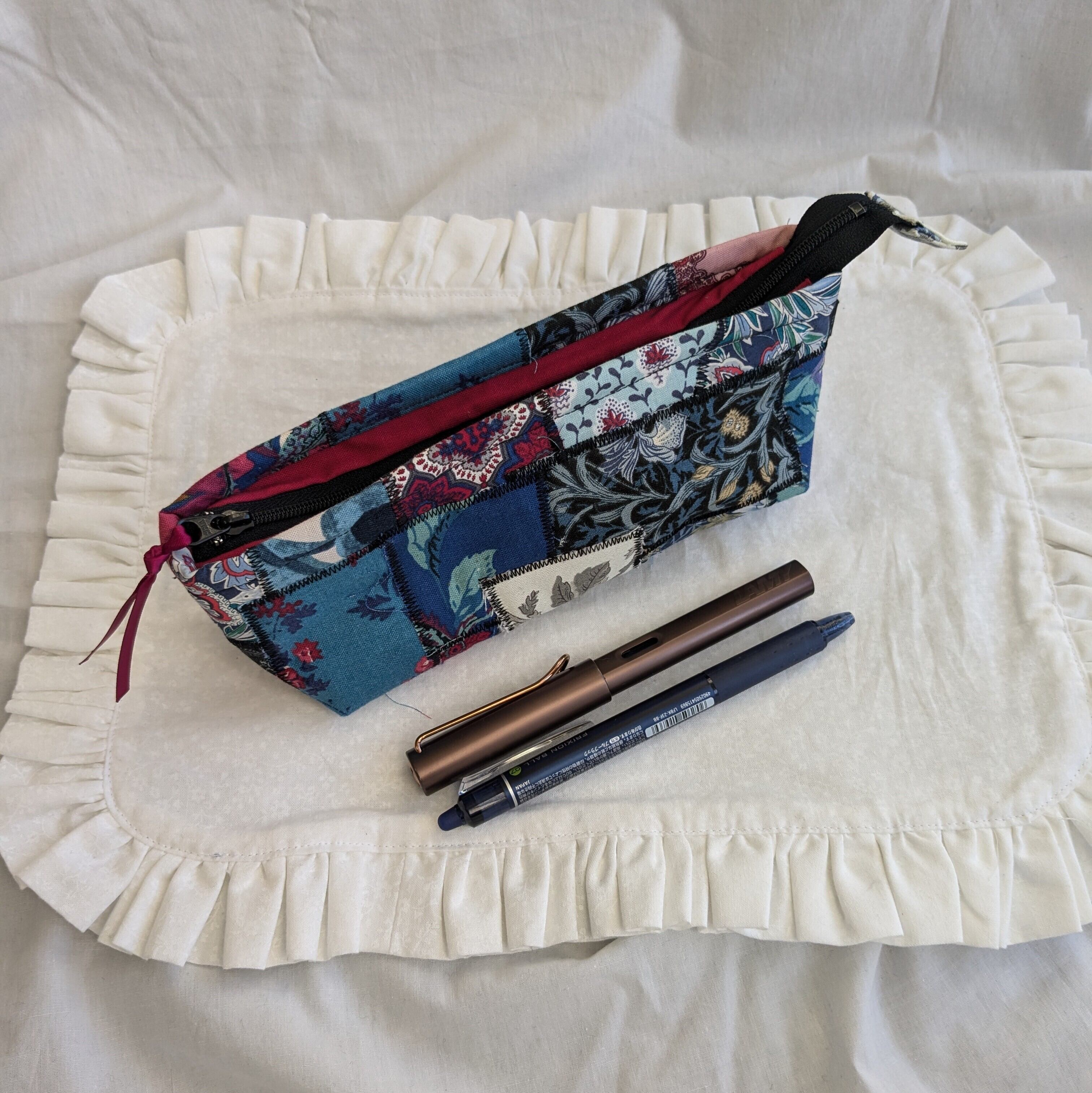 様々な柄の布を組み合わせて作った一点もののパッチワークのペンケースです。